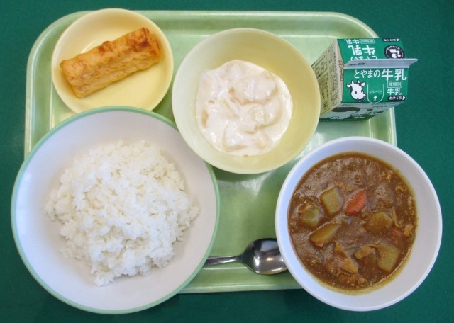 今日の献立は、「ごはん、牛乳、カレーライス、卵ロール、フルーツヨーグルト」でした。