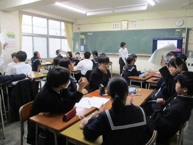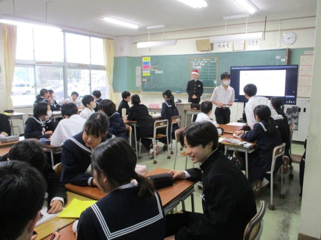 22日(月)学年レクリエーション【1学年】 公開日 2025/12/22 更新日 2025/12/27 1学年 1年生は、5限に学年レクリエーションを行いました。学年生徒会が理科室からリモート配信し、クイズなどで楽しく盛りあがりました。 +1