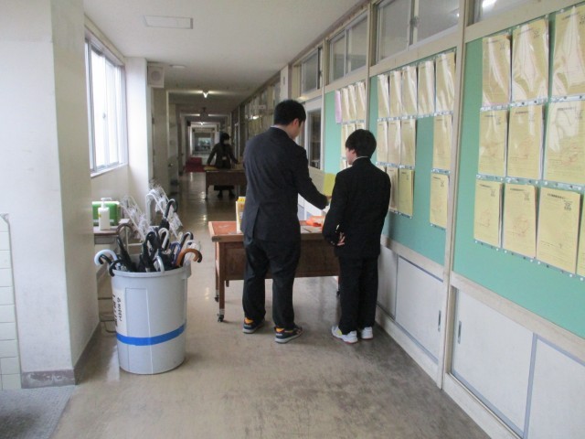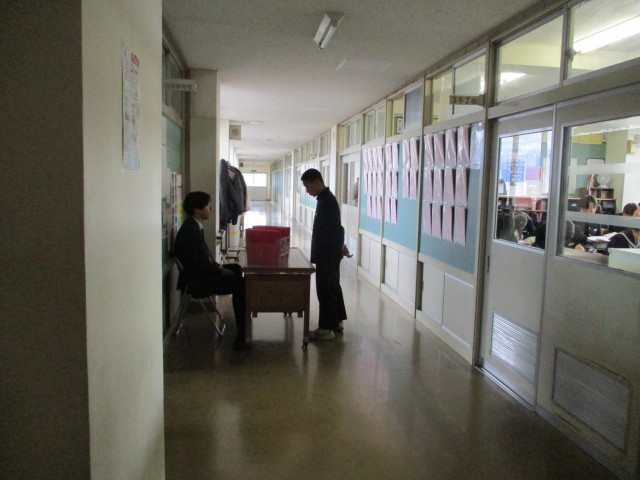 終業式後の学活では、担任が通知表を渡しながら、生徒と振り返りを行っていました。