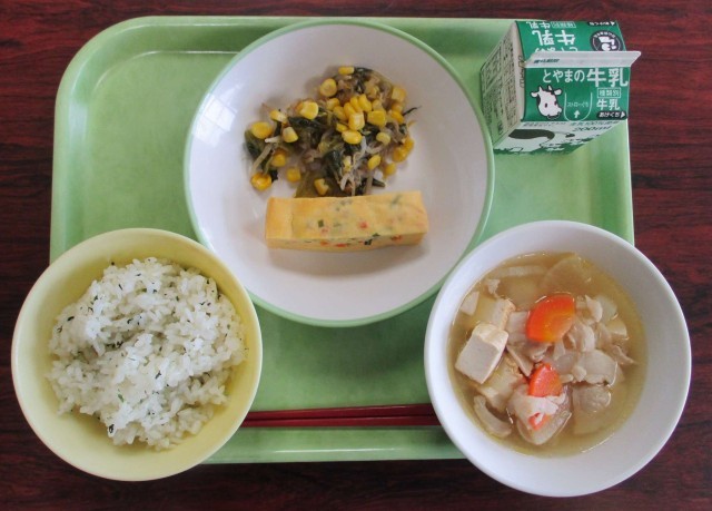 今日の献立は、「菜めし、牛乳、千草焼き、チンゲンサイソテー、豚汁」でした。