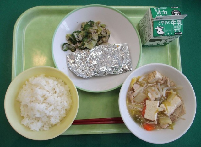 今日の献立は、「ごはん、牛乳、さば揚げ魚のみぞれだれ、昆布和え、はくさいなべ」でした。