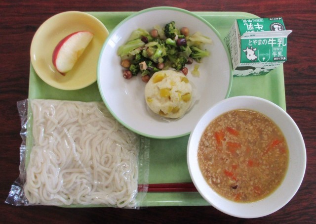 21日(水)今日の給食 公開日 2026/01/21 更新日 2026/01/21 東部中学校の様子 今日の献立は、「ソフト麺、牛乳、ソフト麺の肉みそ、蒸しパン、ビーンズサラダ、りんご」でした。生徒たちに大人気メニューの「ソフト麺」は、肉みそのあんと麺がよく絡んで、とてもおいしかったです。