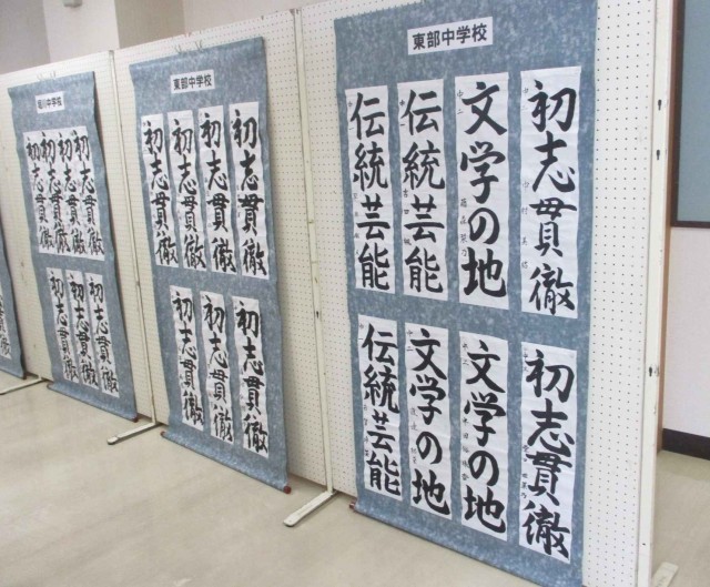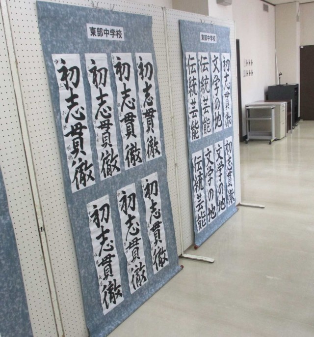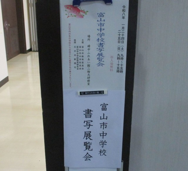 24日(土)富山市中学校書写展覧会 公開日 2026/01/24 更新日 2026/01/24 東部中学校の様子 1月24日(土)、25日(日)9時~15時に、婦中ふれあい館2階大研修室で、富山市書写展覧会が開催されています。東部中学校から、15人の生徒の作品が展示されています。