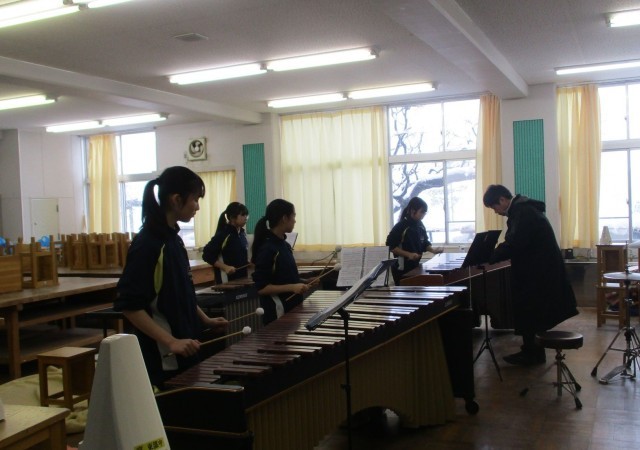24日(土)富山県アンサンブルコンテストに向けて 公開日 2026/01/24 更新日 2026/01/25 部活動 吹奏楽部の打楽器四重奏のメンバーは、明日の富山県アンサンブルコンテストに向けて、一生懸命練習に励んでいました。