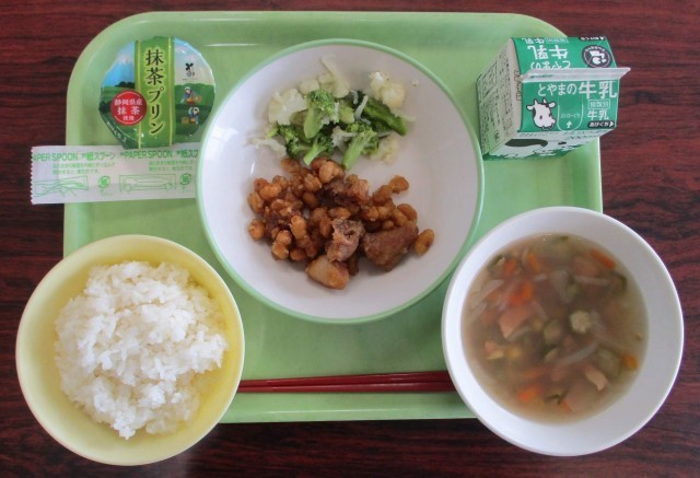 今日は、「音楽」にちなんだ献立で、「ごはん、牛乳、豚肉と豆のハニーマスタードソースからめ、花野菜サラダ、きらきらぼしスープ、お茶プリン」でした。
