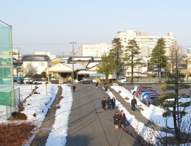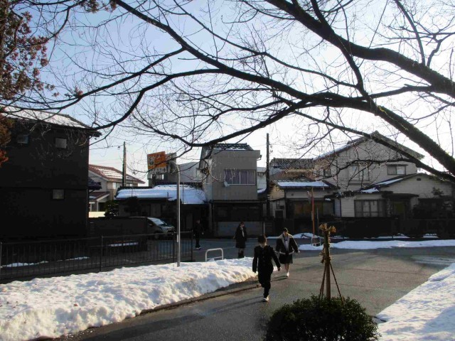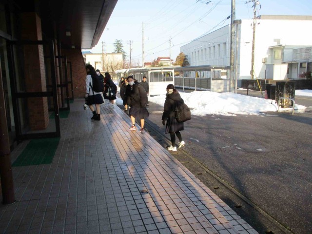 路面が凍結していますが、陽ざしが差し込む明るい朝です。
