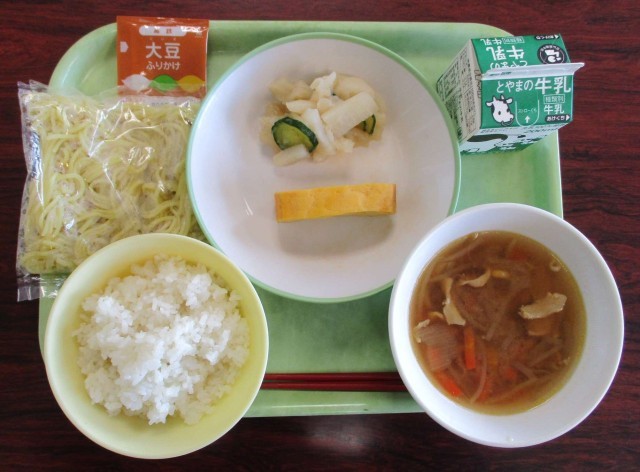 今日の献立は、「ごはん、牛乳、厚焼き卵、かぶの色どり、サッポロラーメン、大豆ふりかけ」でした。
