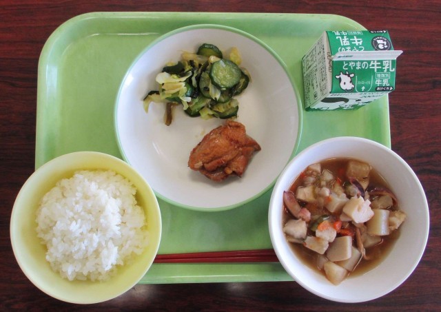 13日(金)今日の給食「きときとランチ」 公開日 2026/02/13 更新日 2026/02/13 東部中学校の様子 今日の献立は、「ごはん、牛乳、照焼きチキン、海藻サラダ、里芋といかの煮物」でした。 今日は、富山県の郷土料理や特産品などを取り入れた「きときとランチ」の日です。富山湾で水揚げされたスルメイカや、南砺市や上市町が主な産地の里芋を使った「里芋といかの煮物」を、富山らしさを味わいながらおいしくいただきました。