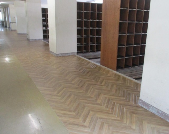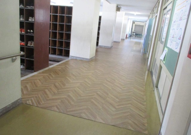 随分年季が入っていた生徒玄関廊下のマットを、用務員さんが木目調のクッションシートに敷き替えてくださいました。