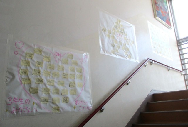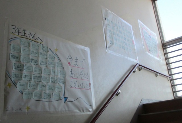 教室棟の階段に、1・2年生でクラスごとに作成した3年生のみなさんへの感謝のメッセージが掲示されています。