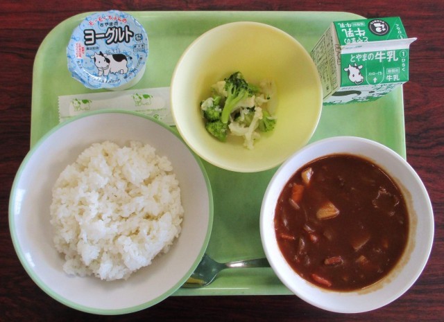 今日の献立は、「ごはん、牛乳、たべキリンハヤシ、花野菜サラダ、ヨーグルト」でした。