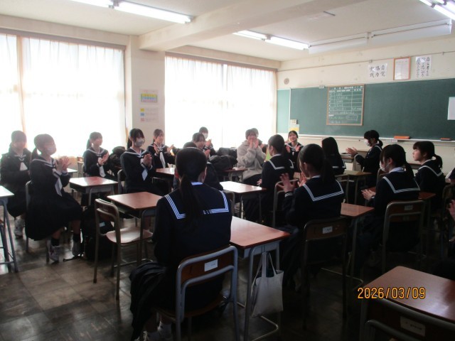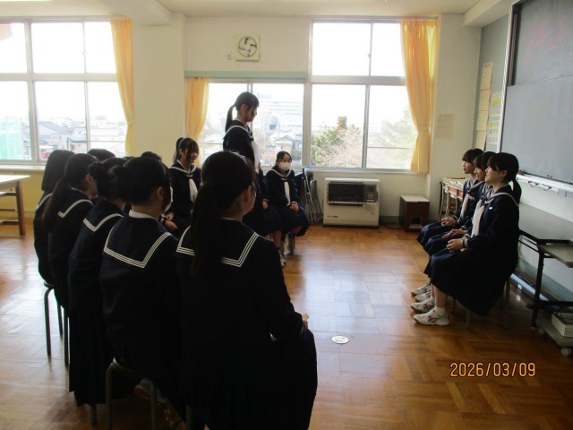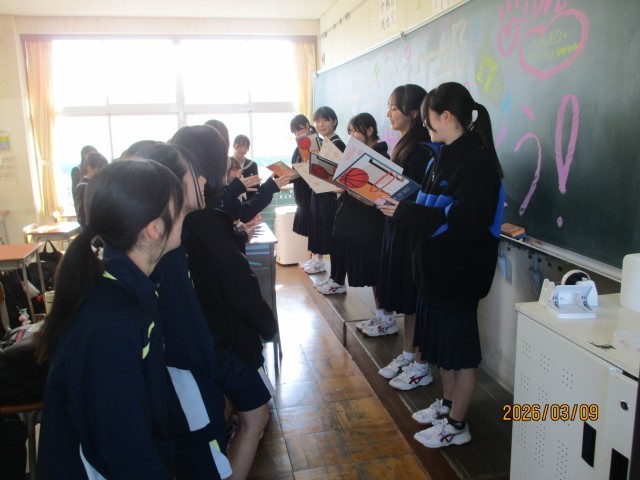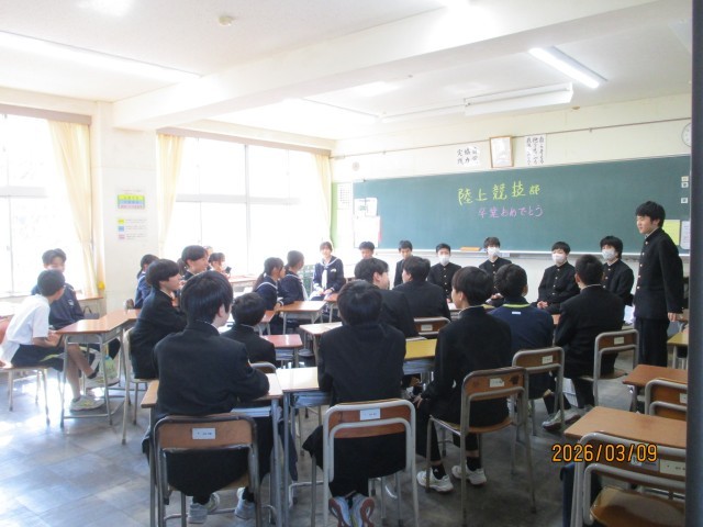 9日(月)部活動ミーティング(お別れ会)その1 公開日 2026/03/09 更新日 2026/03/09 東部中学校の様子 部活動ごとに、感謝の思いを込めたお別れ会が行われました。【写真1枚目:女子バレーボール部】【写真2枚目:剣道部】【写真3枚目:女子バドミントン部】【写真4枚目:女子バスケットボール部】【写真5枚目:陸上競技部】 +2