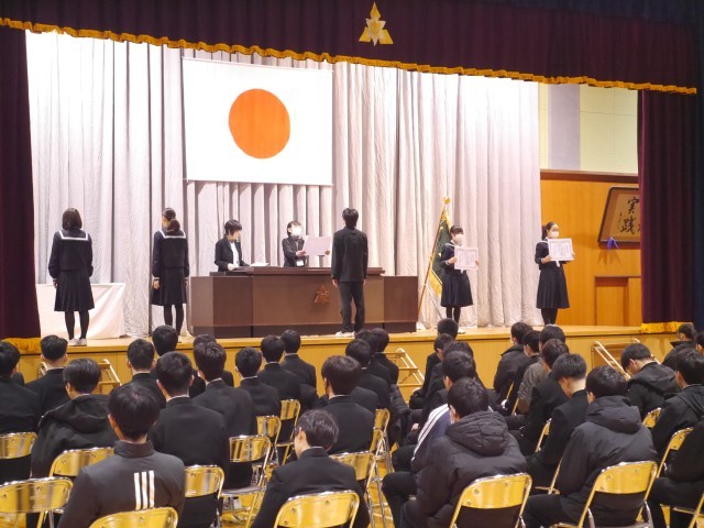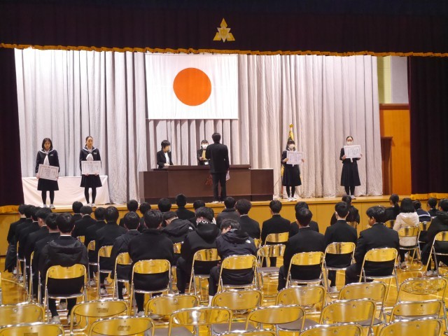 11日(水)県中体連・県中文連表彰 公開日 2026/03/11 更新日 2026/03/11 東部中学校の様子 3年間、スポーツや芸術文化活動で活躍し、優れた成績を収めた生徒に表彰状が授与されました。