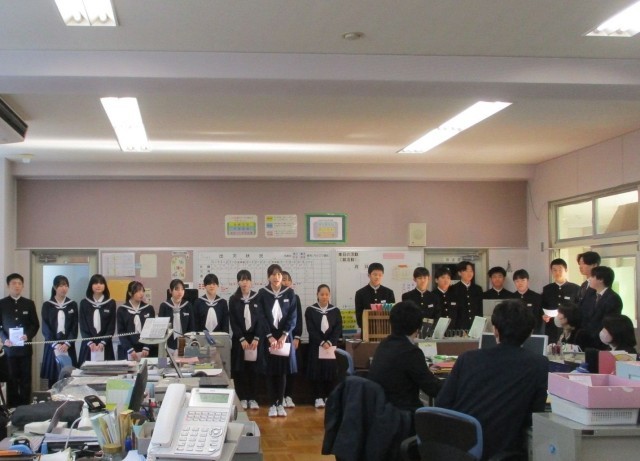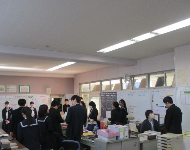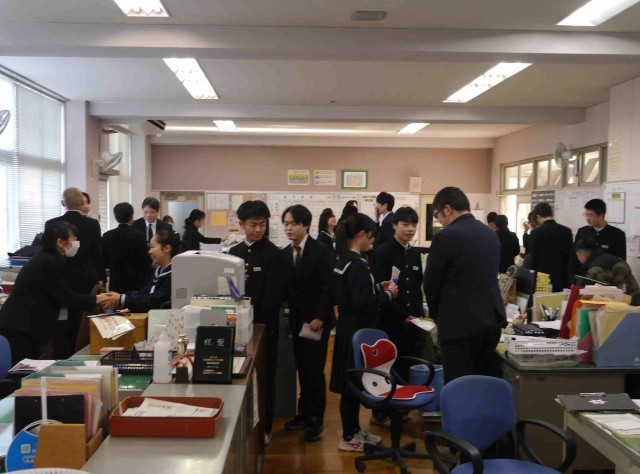 11日(水)教職員への感謝のメッセージ【3学年】 公開日 2026/03/11 更新日 2026/03/11 3学年 朝、職員室で3年生の代表生徒から、お世話になった教職員へ3年生の生徒たちが書いた感謝のメッセージが贈られました。