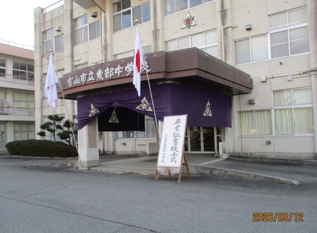12日(木)卒業式の朝 公開日 2026/03/12 更新日 2026/03/12 東部中学校の様子 卒業式の朝を迎えました。今朝は、少し肌寒さもありますが、清々しい青空が広がっています。9時30分より、第79回卒業証書授与式を行います。