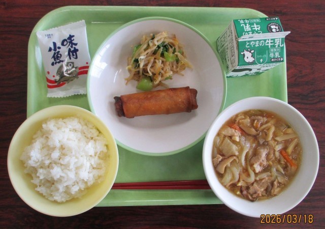 18日(水)今日の給食 公開日 2026/03/18 更新日 2026/03/18 東部中学校の様子 今日の献立は、「ごはん、牛乳、春巻き、香味和え、八宝菜、味付け小魚」でした。「香味和え」は、もやしのシャキシャキの食感がよく、ごま油の風味も効いていて、とてもおいしかったです。