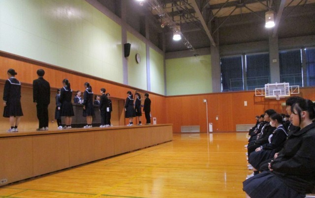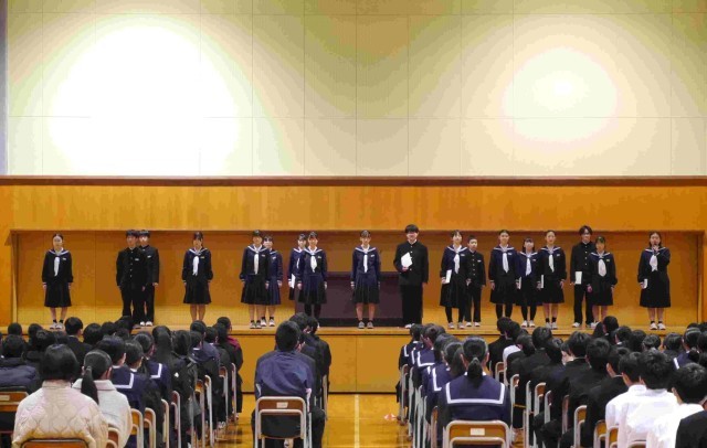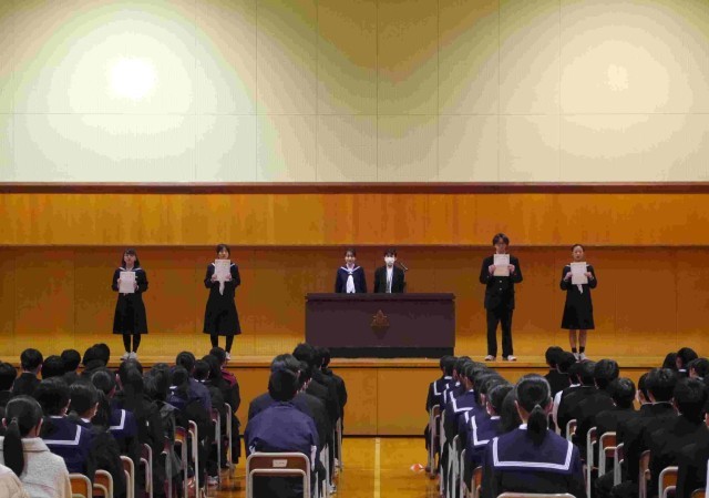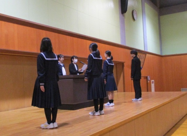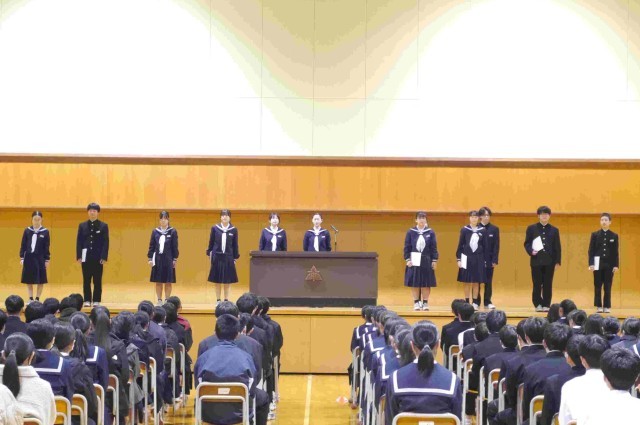 19日(木)生徒会役員認証・任命式 公開日 2026/03/19 更新日 2026/03/20 生徒会 5限に、令和8年度前期生徒会役員の認証式及び任命式を行いました。校長先生から後期生徒会長と生徒会副会長に任命書が授与されました。また、生徒会長から執行部員に委嘱状が、各専門委員長に任命書が授与されました。新旧それぞれの生徒会役員を代表して、後期生徒会長と前期生徒会長からあいさつの言葉がありました。 +3