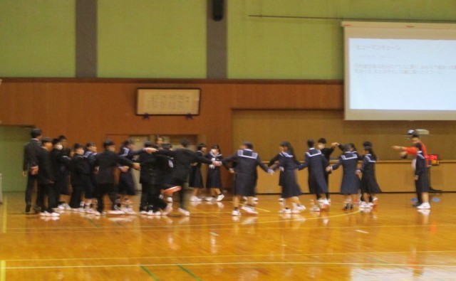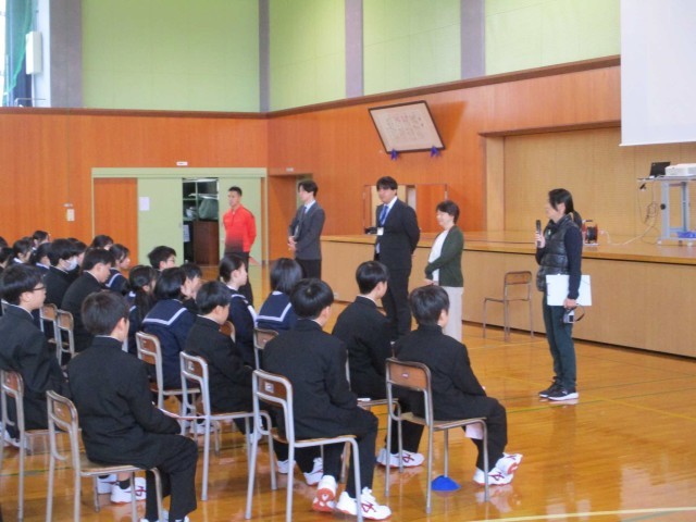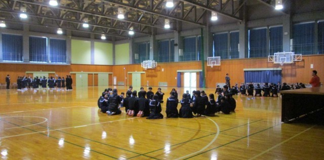 13日(月)学年集会【1学年】 公開日 2026/04/13 更新日 2026/04/13 1学年 1年生は、2・3限に学年集会を行いました。学年の先生方から学年への思いが語られた後、学年主任の先生から、1日の流れや大切にしたいことを生徒たちに伝えました。また、学年全体で仲間づくり・集団づくりのエンカウンターを行いました。