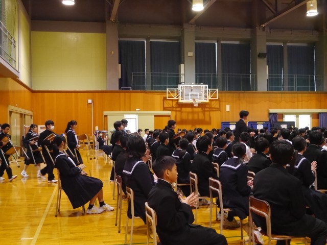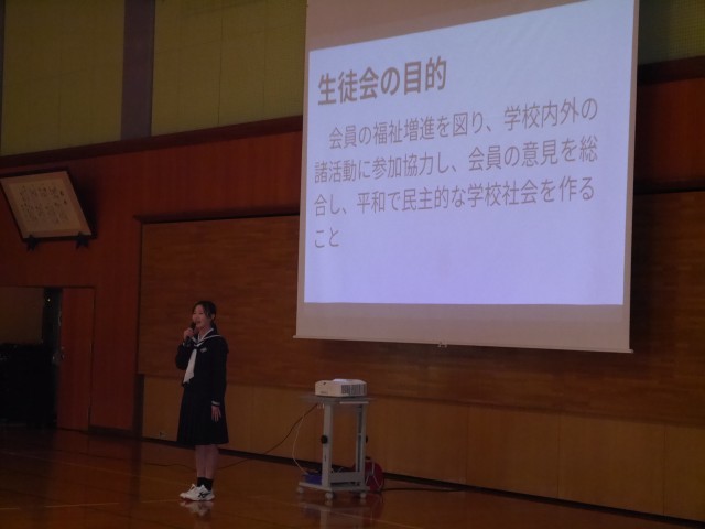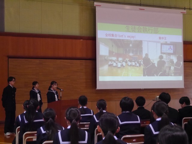 14日(火)生徒会入会式・部活動紹介1 公開日 2026/04/15 更新日 2026/04/15 東部中学校の様子 5・6限に生徒会入会式・部活動紹介を行いました。大きな拍手で1年生を迎えました。生徒会入会式では、生徒会長から入会の言葉が贈られ、執行部や各専門委員長が生徒会活動の紹介をしました。 +1