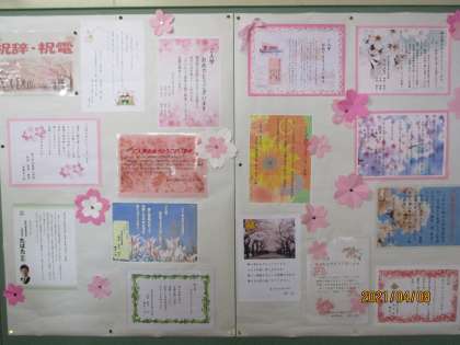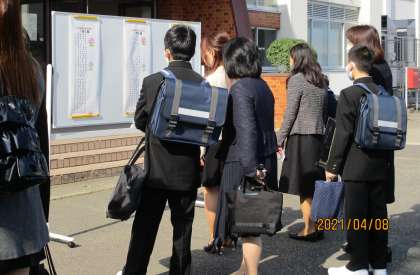 今日は入学式です。受付時間の8時30分前から、新入生や保護者の方々が生徒玄関前に集まりました。