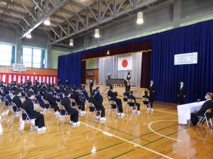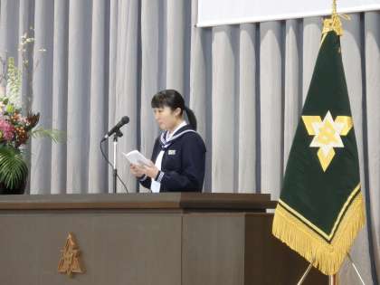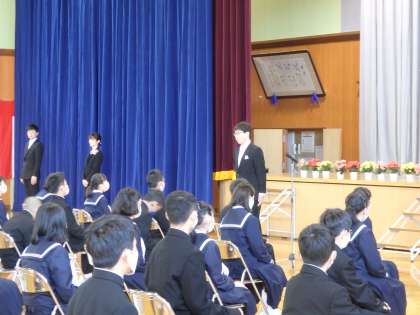 生徒会長から歓迎の言葉の様子です。 1学年担当教諭の紹介です。