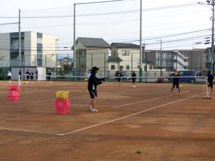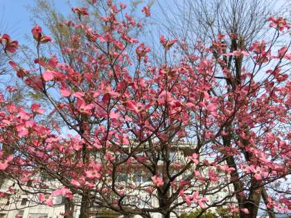 ピンク色のハナミズキがきれいに咲いています。風は冷たいですが、空は青くて、爽やかです。1年生の仮入部期間で先輩たちも張り切っています。