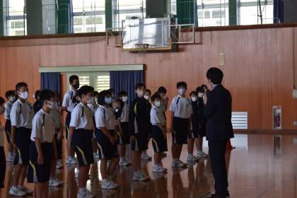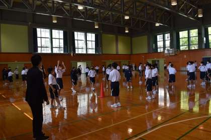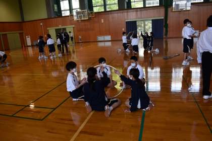 なかよくなろう集会 公開日 2021/04/23 更新日 2021/04/23 1学年 1学年では5、6限になかよくなろう集会を行いました。ボールパスゲーム、ヘリウムフープ、星型づくり、大縄飛びの4種目をしました。仲間と協力して楽しむことができました。