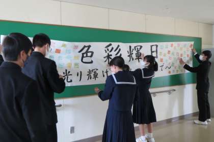 3学年目標完成!! 公開日 2021/04/24 更新日 2021/04/24 3学年 学年目標が完成し、学年生徒会執行部のメンバーが掲示してくれました。1人1人が輝く1年となるよう、努力を重ねていきましょう!!