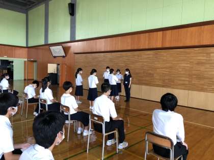 学年生徒会主催の学年集会が行われました。 クラスの振り返りや学級MVPの表彰、夏休み中の生活についての話がありました。