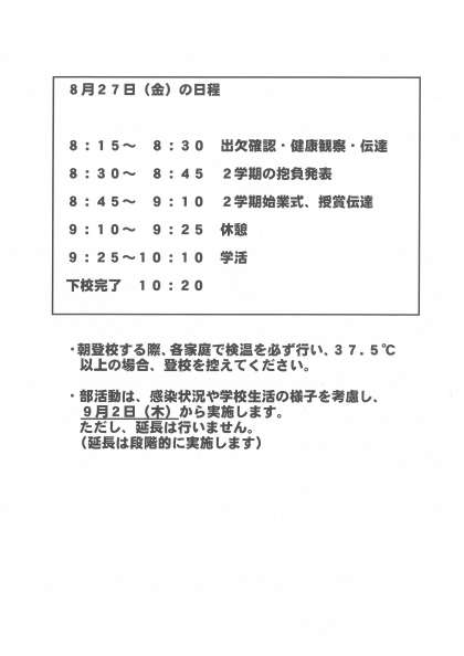 新型コロナウイルス感染症警戒レベル「ステージ3」及び 「まん延防止等重点措置」適用下における対応等について、8月27日(金)の日程をお知らせします。