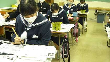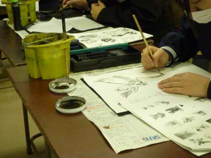 美術の水墨画の授業も終盤となりました 見本を見ながら龍や虎などを描いています