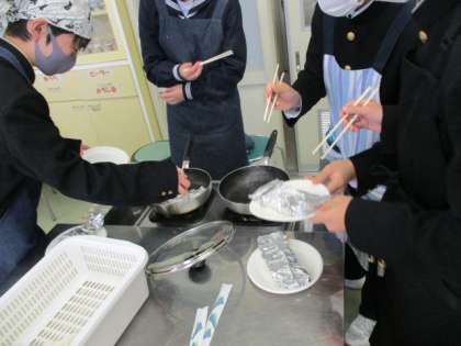 11H:家庭 調理実習でちゃんちゃん焼きの練習をしました。 みそともやしの美味しそうなにおいがしています。