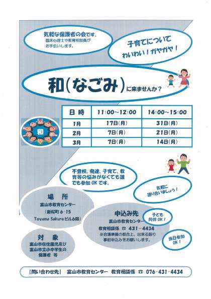 富山市教育センター教育相談係からのリーフレット 公開日 2022/01/06 更新日 2022/01/06 東部中学校の様子 富山市教育センター教育相談係からリーフレットにより「和」(なごみ)の案内がありました。希望される方は問い合わせ先までご連絡ください。