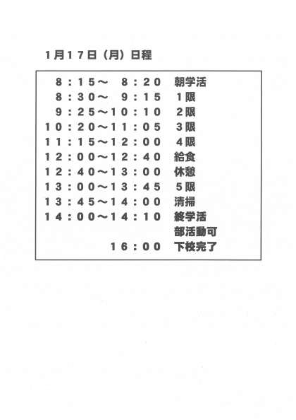 1月17日(月)の予定について 公開日 2022/01/14 更新日 2022/01/14 東部中学校の様子 1月17日(月)の予定を以下のように変更します。今後、変更がある場合、ホームページや安全メールでお知らせします。