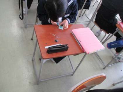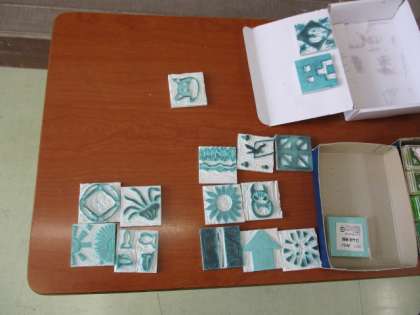 「消しゴムに文様を彫ろう」ひとり一人が思い思いの模様を描いた消しゴムはんこを作っています。完成したら布にスタンプしてオリジナルハンカチにします。