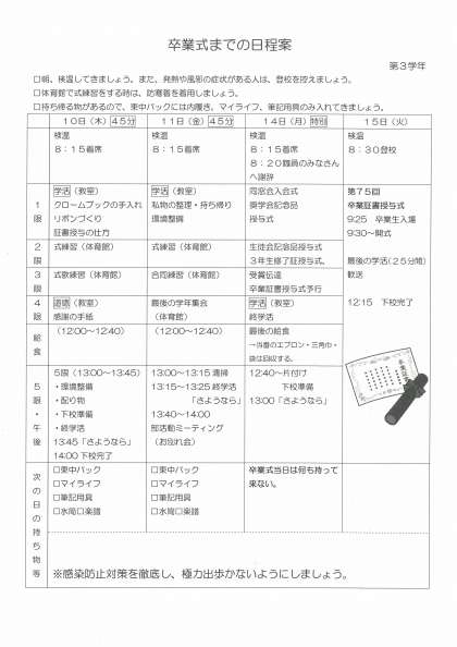 3年生 卒業式までの日程 公開日 2022/03/09 更新日 2022/03/09 3学年 県立一般入試を受験したみなさん、2日間お疲れさまでした。無事に終わってほっとしていることと思います。家でゆっくり休んで疲れをとってください。そして、3年生のみなさん、15日の卒業式に備えて、感染予防を徹底して体調管理に努めましょう。