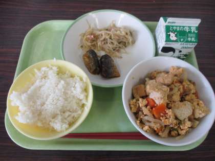 14日(木) きょうの給食 公開日 2022/04/14 更新日 2022/04/17 きょうの給食 今日の給食を紹介します。上左から 平皿(はりはりソテー、いわしの梅煮) 牛乳 厚揚げの錦とじ ごはん 「はりはりソテー」は、噛み応えのある音から「はりはり」と言われている切り干し大根を「ソテー」というフランス料理の調理法で仕上げたメニューです。