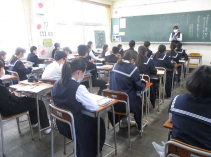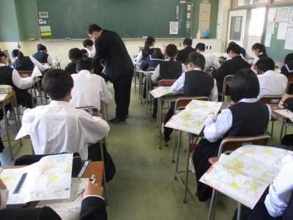 1年生の授業の様子を紹介します。 【写真上:社会】 【写真中:国語】 【写真下:保健体育】