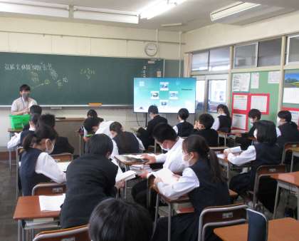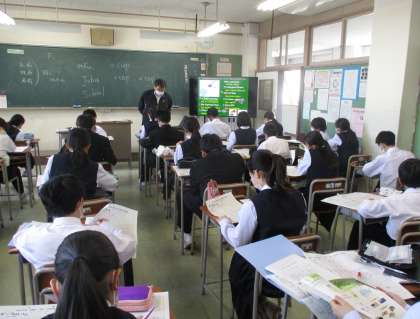 1年生の授業の様子を紹介します。 【写真上:学活】 【写真中:理科】 【写真下:英語】