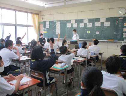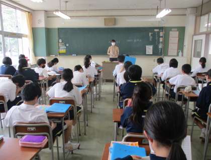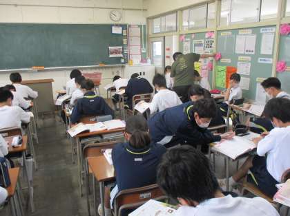 1年生の授業の様子を紹介します。 【写真上:家庭科】 【写真中:社会】 【写真下:数学】