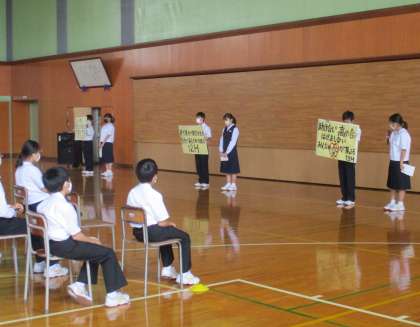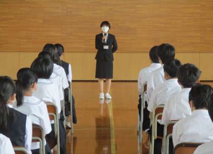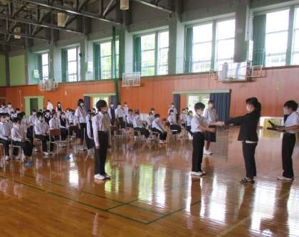 1日(水)学年集会【1年】 公開日 2022/06/01 更新日 2022/06/01 1学年 6限に行った1年生の学年集会の様子です。 各クラスの会長から学級目標の紹介があった後、満点コンテストの表彰式を行いました。 また、教育実習生の尾島先生からお話を聞きました。
