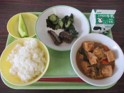 8日(水) きょうの給食 公開日 2022/06/08 更新日 2022/06/09 きょうの給食 今日の給食を紹介します。上左から メロン 平皿(酢の物、いわしの土佐煮) 牛乳 厚揚げのみそ煮込み ごはん 木綿豆腐を高温で揚げた「厚揚げ」は、煮物にも炒め物にもよく合う具材です。濃いめの味付けのみそ煮込みにもピッタリで、ボリュームたっぷりの一品でした。
