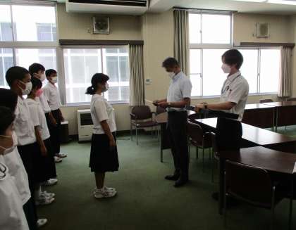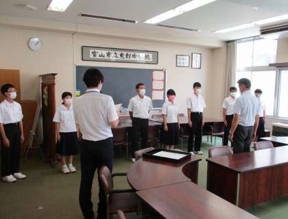 本日の昼休憩時、各クラスの自転車通学生を代表するサイクル安全リーダーの任命式を行いました。東中生の交通ルール遵守と交通マナーの向上をめざして、よろしくお願いします!