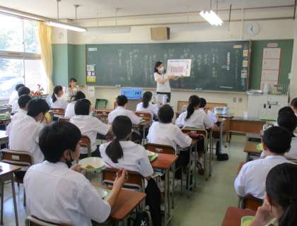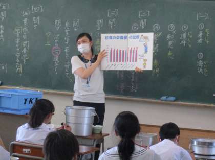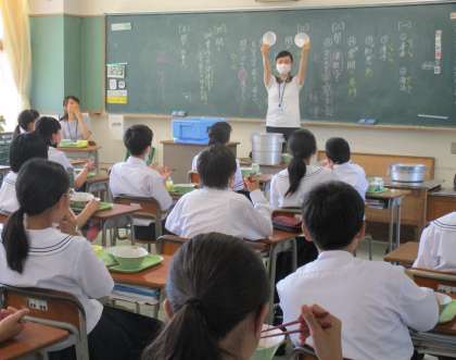 30日(木)栄養士訪問 公開日 2022/06/30 更新日 2022/06/30 1学年 南学校給食センター栄養職員の大谷先生が、給食中の1年1組を訪れ、給食についての講話をしていただきました。小学校と中学校での給食の違いや食事の大切さなど、興味深いお話しを聞くことができました。