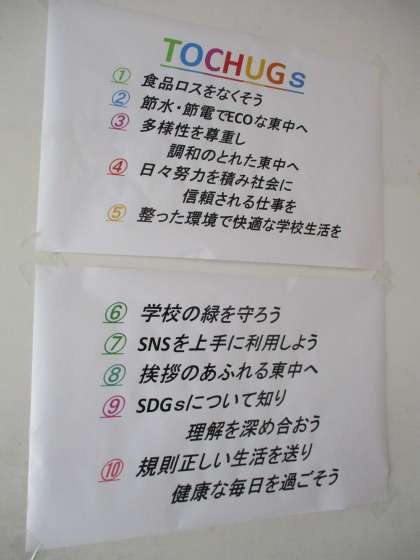東中生によるSDGs活動を示す「TOCHUGs(トーチュージーズ)宣言」が、校内に掲示されています。