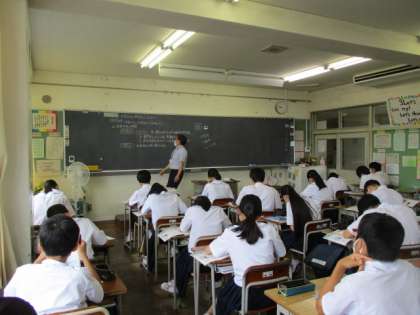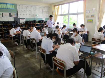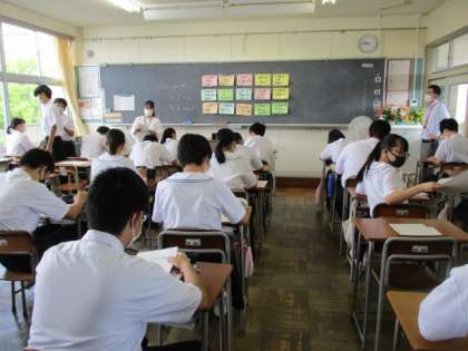 3年生の授業の様子を紹介します。 【写真上:理科】 【写真中:社会】 【写真下:英語】