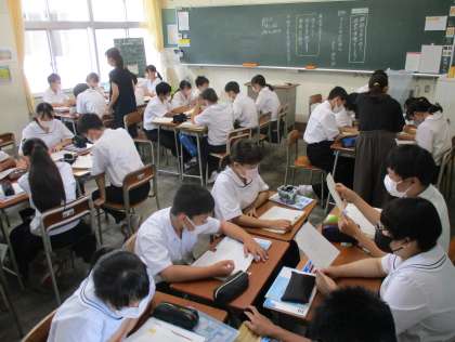 1年生の授業の様子を紹介します。 【写真上:理科】 【写真中:国語】 【写真下:社会】