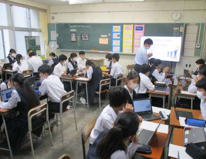 午前中、たくさんの公開授業や研究授業を行いました。どの学年、どの学級も意欲的に学習に取り組む生徒の姿が見られました。