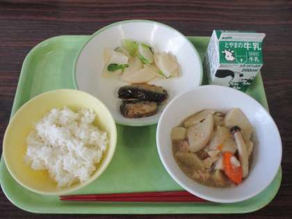 きょうの給食 その1 公開日 2022/10/20 更新日 2022/10/20 きょうの給食 17日(月)の給食を紹介します。上左から 平皿(かぶの色どり、いわしの生姜味) 牛乳 鶏肉と里芋のごま煮 ごはん
