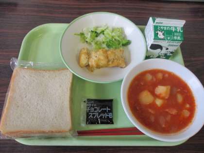 きょうの給食 その2 公開日 2022/10/20 更新日 2022/10/20 きょうの給食 18日(火)の給食を紹介します。上左から 平皿(そえ野菜、魚のえごま揚げ) 牛乳 豆とベーコンのトマト煮 チョコレートクリーム 食パン